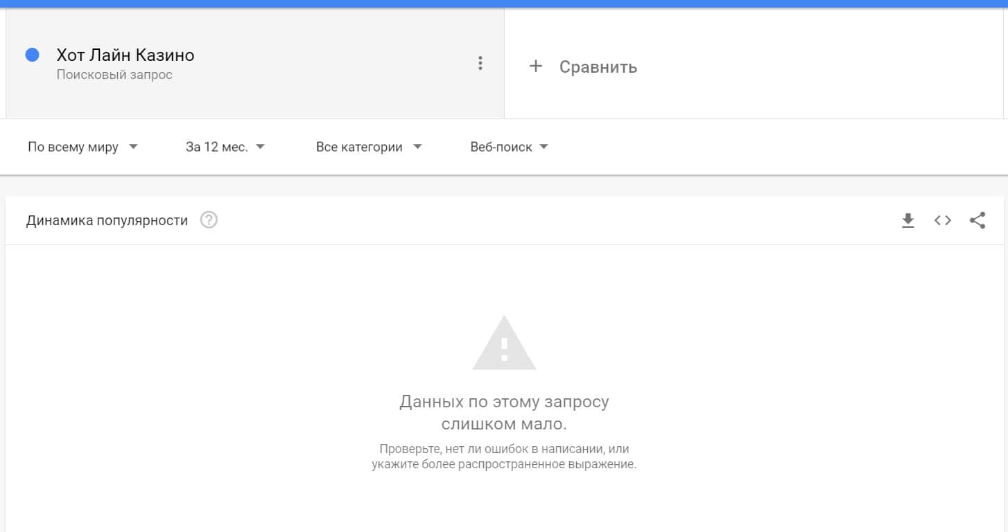 В этом разделе рассмотрим статистику запросов по бренду HotLineCasino в поисковой системе Гугл Ком. По запросу "hotlinecasino com" нет данных.