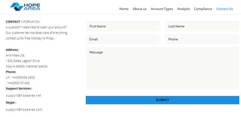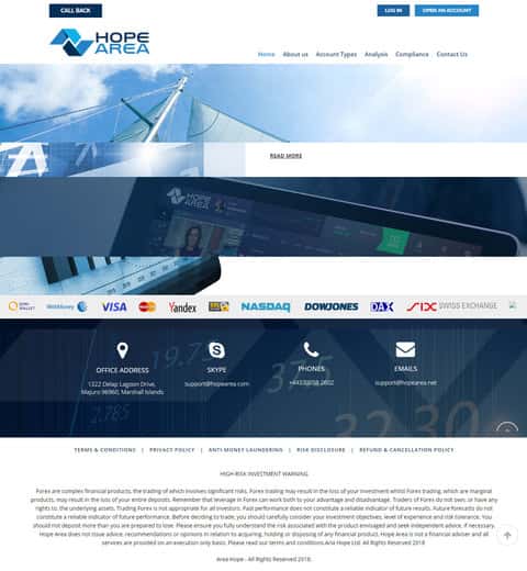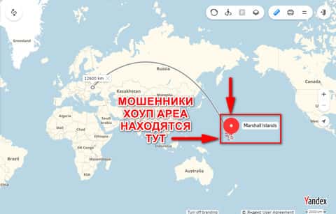 Как и все форекс-кухни, контора ХоупАреа разместила свой главный офис на Маршалловых островах, с которых ведет свою мошенническую деятельность во всех странах мира, не боясь ни законов, ни оплаты налогов. Если вдруг вас кинули, то вот представлен адрес главного офиса: 1322 Delap Lagoon Drive, Majuro 96960, Marshall Islands.