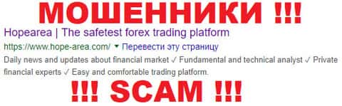 ХоупАреа - это мошенническая организация, которая работает на благо набивания своих карманов путем обмана клиентов. Жулики завлекают новых жертв торговлей на Форекс и делают это на столько интенсивно, что уже даже изменили домен на другой, из-за попадания в блэк-листы. Берегитесь шулеров HopeArea!