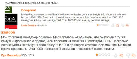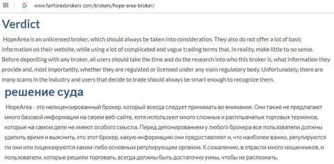 Интернет-ресурс fairforexbrokers com также расследовал деятельность конторы ХоупАреа и после этого рекомендует всем обходить ее стороной. Эта кухня - нелицензированный брокер, который ведет нечестную деятельность по отношению к своим клиентам. Воры под прикрытием форекс-конторы.