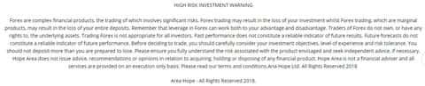 По поводу лицензии, на сайте конторы HopeArea нигде не упоминается, поэтому можно смело утверждать, что брокер не регулируемый. Единственное что вместо лицензии они оставили, так это предупреждение о рисках, которые будут нести клиенты, работая с лохотроном ХоупАреа.