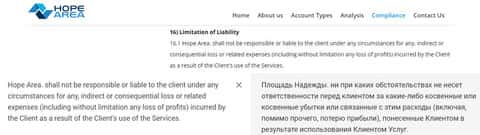 Договор конторы HopeArea просто прошит дырами, через которые можно увильнуть от ответственности. Вот например один из пунктов ограничения ответственности, где жулики не несут ответственности перед клиентом, который может понести потери при работе через их сервис.