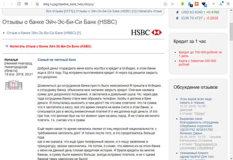 Есть один отзыв, в котором рассказывается печальная история о том, как на пустом месте вас могут обмануть на деньги, тем самым "залезть" в ваш кошелек. Женщине надо было оформить кредит, поэтому она обратилась в несколько банков. В HSBC ей сказали, что заявка будет обработана в течении 4 дней, и будет сказан вердикт. Но после долгих обработок, ей просто открыли счет, за который она "торчит" денег.