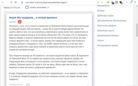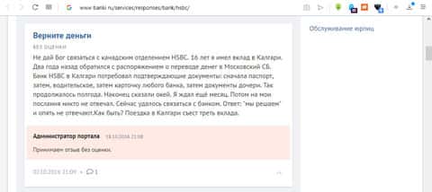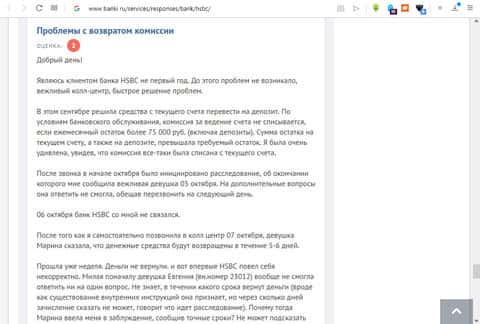 На портале banki ru есть множество отзывов о работе банка ЭйчЭсБиСи, большинство которых отрицательные (около 95%). Один из пользователей этого сервиса по совместительству клиент данного банка рассказал о том, какой у них "отзывчивый и проффесиональный" персонал, что во время звонка, который был сделан для решения проблемы, не было получено ни единого ответа на задаваемые вопросы.