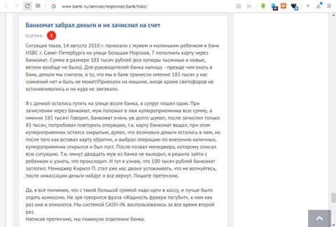 Один из бывших клиентов HSBC, который стал таковым из-за непредвиденного стечения обстоятельств, раскритиковал работу последнего, особенно в отделении, находящемся в культурной столице Российской Федерации, в Санкт-Петербурге. Из слов, которые произносят уста автора отзыва, можно понять, что данный банк живёт за счет наворованных денег у наивных людей.