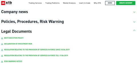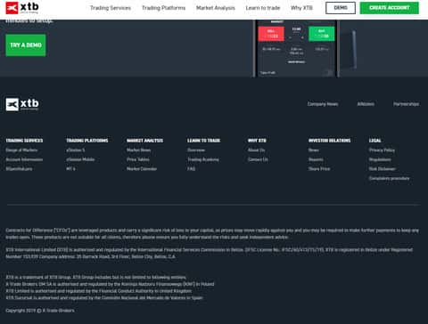Ну и завершается сайт у лохотрона XTB довольно стандартно, а именно меню со ссылками на различные разделы сайта мошенников ХТБ, а так же предупреждением о рисках, в котором аферисты XTB снимают с себя всю ответственность за потери наивной клиентуры в данной кухне. На изображении, расположенном ниже, вы можете увидеть окончание сайта жуликов ХТБ.