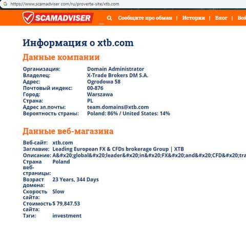 В связи с мошеннической и противозаконной деятельностью в течении последних лет реальные руководители аферистов XTB предпочитают анонимность дабы избежать ответственности со стороны правоохранительных органов. Информацию о самом же сайте мошенников ХТБ можно узнать с помощью портала scamadviser com, который вы можете увидеть ниже.