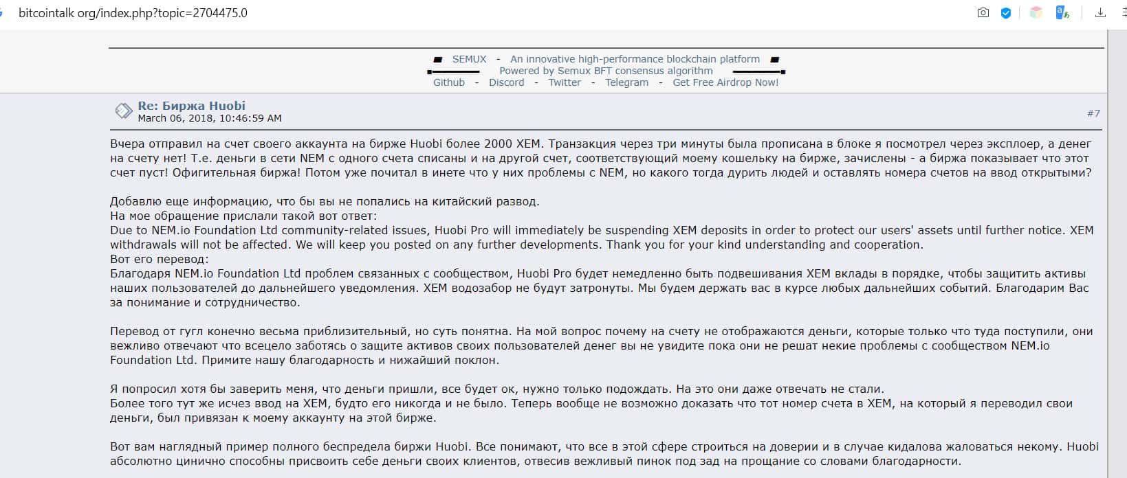 На форуме bitcointalk org пользователь опубликовал свой отзыв, где он подробно рассказал, как его кинули шулера из Хуоби. Он отправил на свой кошелек более 2000 XEM. Средства списались с его счета, но на счет Хуби не поступили. После этого исчезли все данные о транзакции и доказать перевод теперь невозможно.
