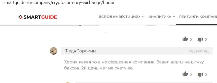 Еще один комментарий негативного содержания о работе криптобиржи Хуоби появился на сайте smartguide ru. Федя Сорокин назвал брокера несерьезной компанией и рассказал, почему. Он купил криптовалюту, потратив на это 1000 долларов, и перевел средства на свой кошелек, созданный на площадке Huobi, но в результате так и не увидел их там.