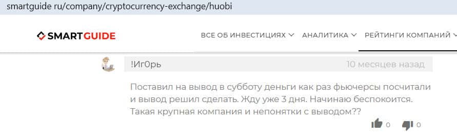 На сайте под обзорной статьей о брокерской компании Хуоби появился ряд комментариев от людей, решившихся поработать с этой биржей. Трейдер по имени Игорь написал, что поставил деньги на вывод, но, спустя несколько дней, он их не увидел. Молодой человек беспокоится, придут ли они вообще.