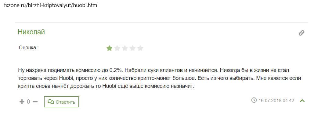Николай поставил бирже Хуоби самую низкую оценку и написал, что никогда не стал бы на ней торговать, если бы знал о том, что организаторы поднимут комиссию. Единственным плюсом для него раньше было большое количество криптомонет, но после увеличения комиссий за сделки он решил покинуть компанию.