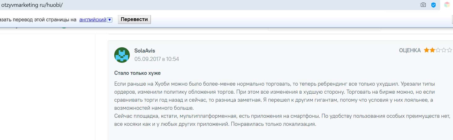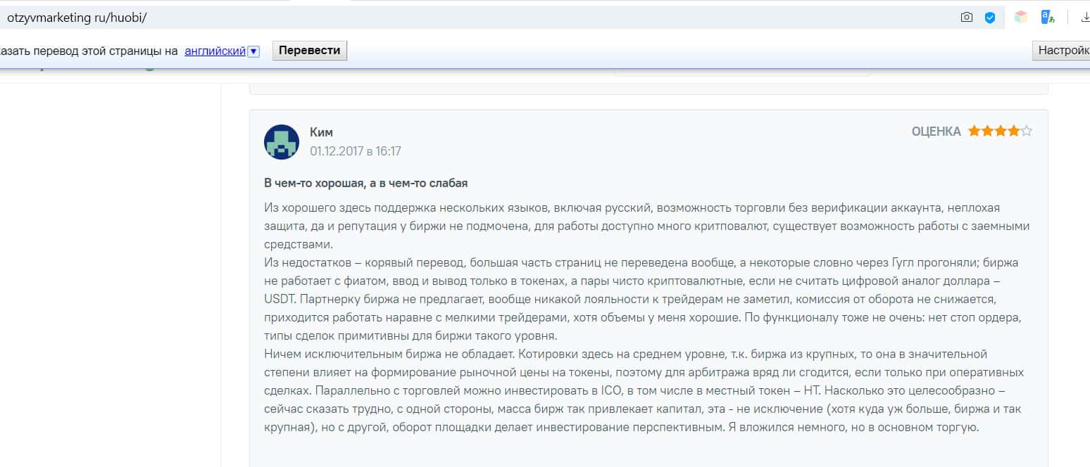 Трейдер с ником Ким описал недостатки биржи Хуоби на сайте otzyvmarketing ru. По его словам, он не заметил никакой лояльности к трейдерам, комиссия не понижается в зависимости от сделок. Деньги можно вывести только в токенах - еще один минус. Перевод текста на русский язык очень плохой.