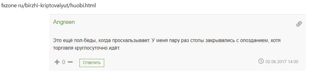 Пользователь с ником Angreen написал комментарий на сайт fxzone ru, что он также сильно недоволен работой терминала. Несмотря на то, что торговля на Хуоби идет круглосуточно, терминал часто виснет, и ордера могут закрыться по стоп-лосам с опозданием. Это приводит к тому, что сделка уходит в еще больший минус.