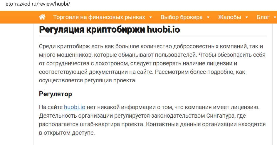 Сайт eto-razvod ru, занимающийся разоблачением цифровых мошенников, часто публикует обзоры компаний, занимающихся торговлей на валютных рынках. Он проверил фирму Хуоби, и выяснил, что никакой лицензии у нее нет. Ее деятельность регулируется законодательными органами Сингапура, которые известны своей лояльностью.