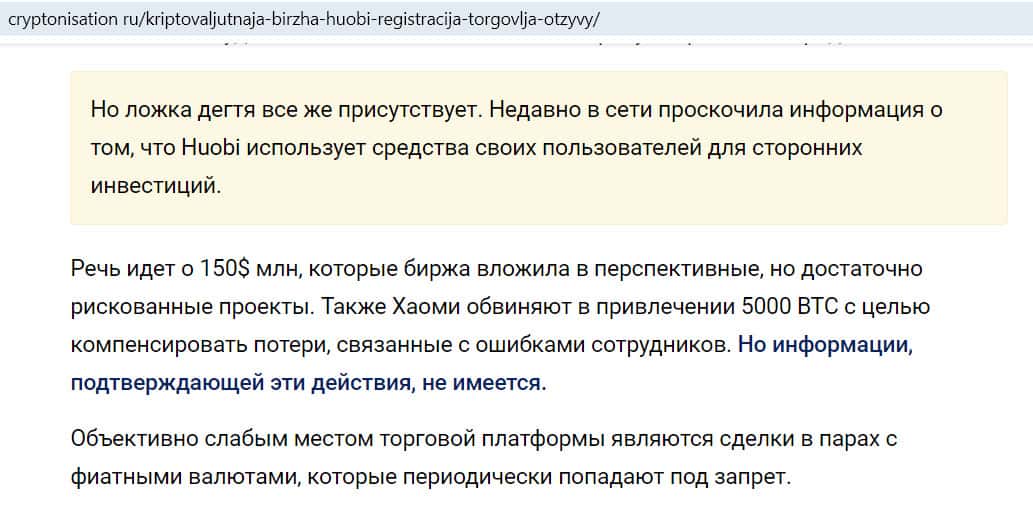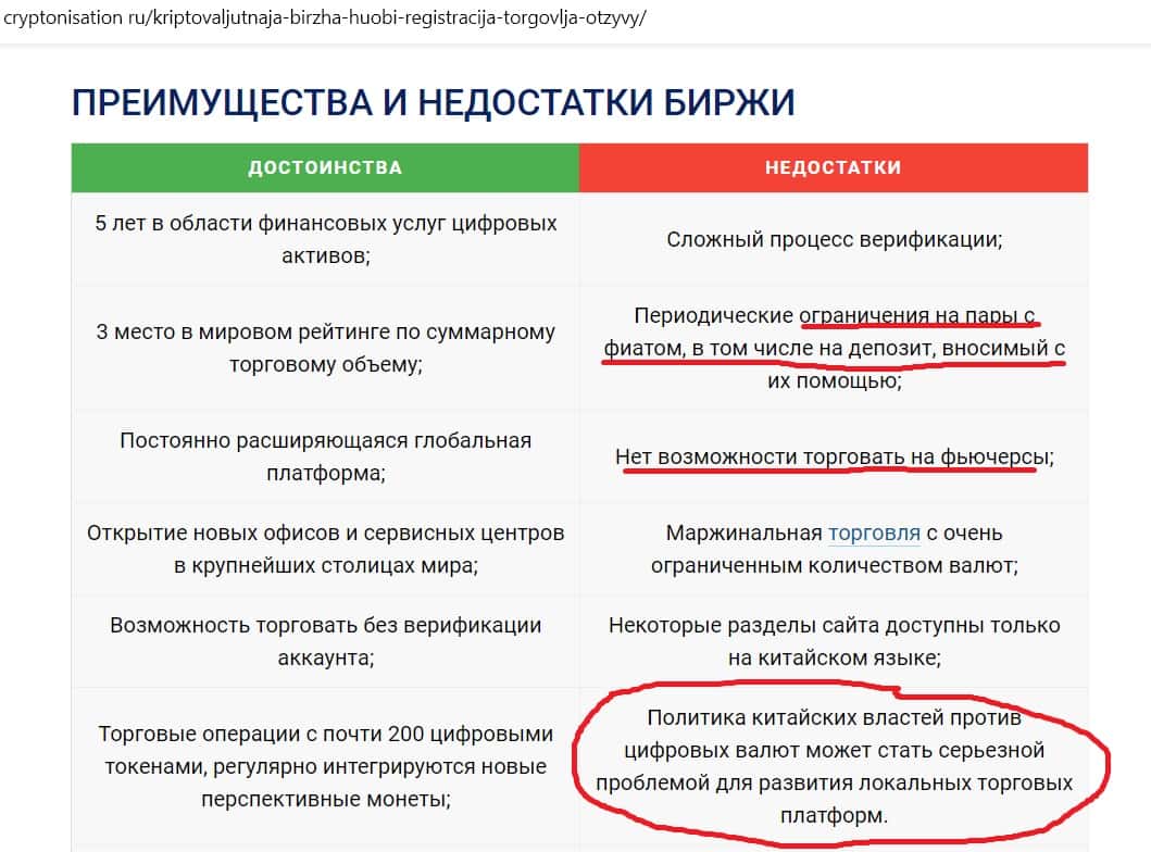 - Список недостатков биржи Huobi, опубликованный на сайте cryptonisation ru