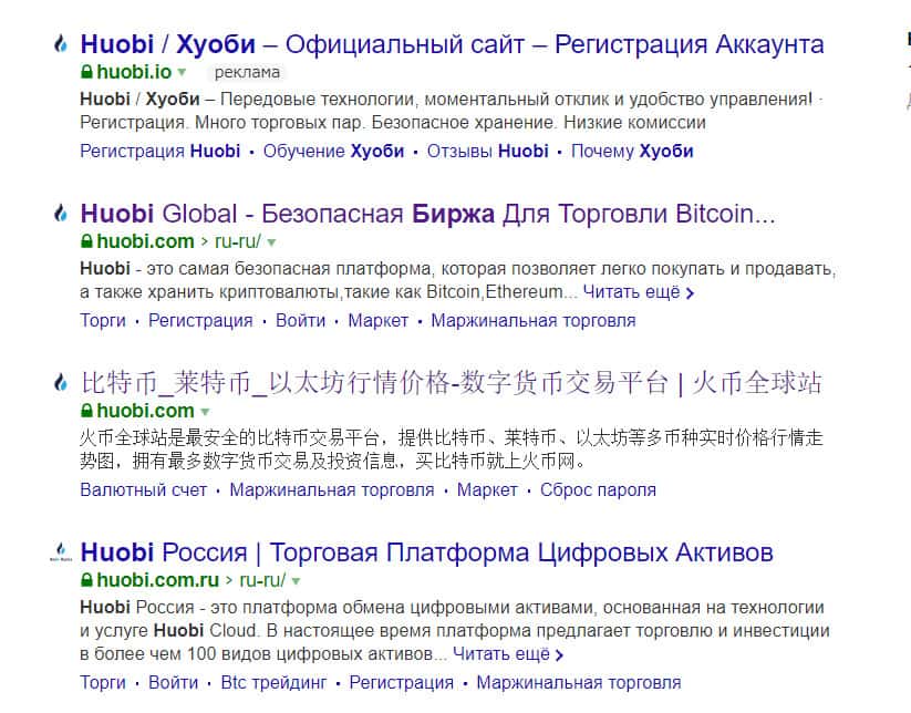 Владельцы компании Хуоби создают множество похожих сайтов, с разными доменными именами, чтобы охватить как можно большую часть аудитории. Клоны имеют немного разные названия: Хуоби, Хуоби Глобал, Хуоби Россия, но они все доступны для русскоязычного населения.