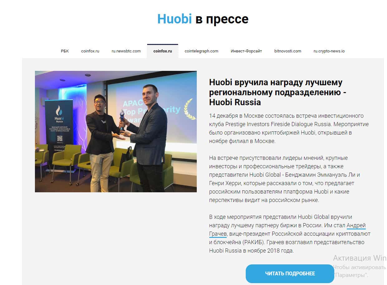 В разделе сайта Хуоби в прессе мошенники активно пиарят сами себя, размещая там проплаченные статьи о том, какие они молодцы и как у них все хорошо. Можно увидеть статью о том, что лучшее подразделение Хуоби находится в России, за что его и наградили, или узнать о планах на будущее проекта в нашей стране.