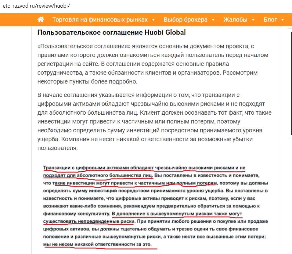 На сайте Эторазвод опубликовано клиентское соглашение с площадки Хуоби Глобал, в котором говорится о том, что торговля цифровыми активами является чрезвычайно опасной и может привести к большим убыткам. Компания не несет никакой ответственности за потерю средств пользователей.
