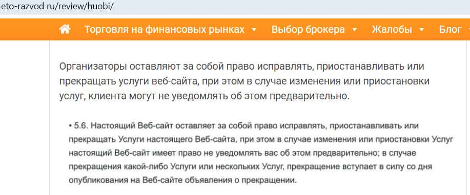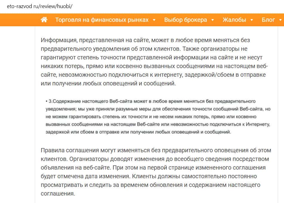 Мало того, информация, выложенная на сайте, может измениться в любое время, но клиентов никто уведомлять об этом не собирается. Далее, организаторы проекта Хуоби даже не могут гарантировать точности информации, которую они предоставляют пользователям. При этом клиенты должны сами следить за всеми изменениями на сайте.