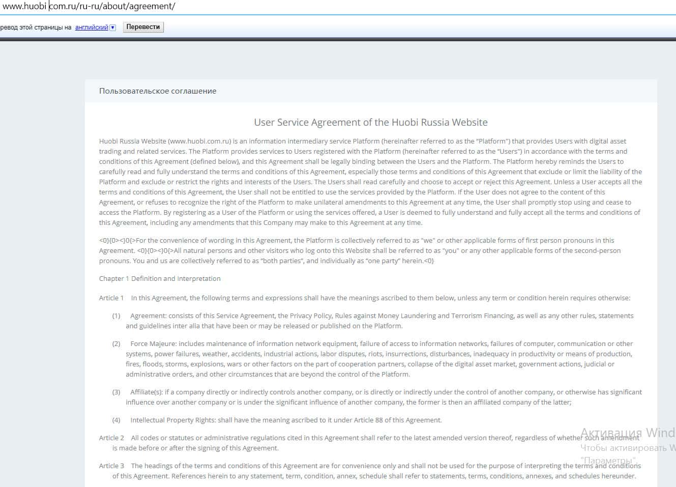 Очень странно, но такой важный документ, как Клиентское соглашение представлен на русскоязычной версии сайта Хуоби только на английском языке. Неужели так трудно перевести на русский несколько страниц документа!? Скорее всего, это было сделано намеренно, чтобы клиенты не видели всех подводных камней трейдинга с Хуоби.