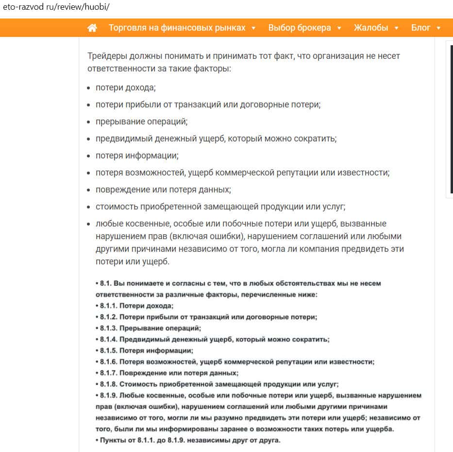 Далее идет целый список факторов, за которые владельцы лохотрона под названием Хуоби не несут никакой ответственности. Среди них не только потеря денежных средств и любой прибыли, полученной на площадке, но и потеря информации, повреждение данных, а также ущерб репутации клиента.