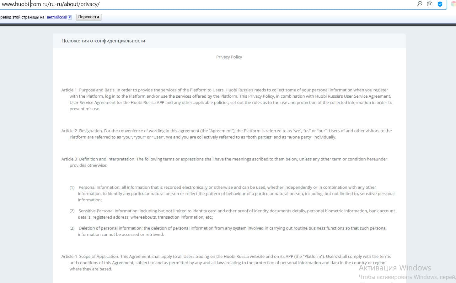Политика конфиденциальности брокерской компании Хуоби так же, как и клиентское соглашение, доступно только на английском языке. Можно предположить, что мошенники говорят в этом документе о том, что оставляют за собой право на сбор всех личных данных пользователя в своих целях.
