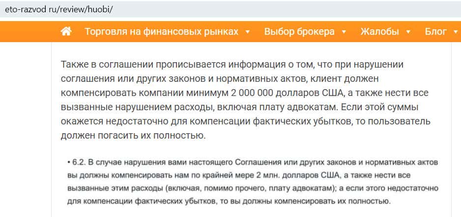 Следующее утверждение является уже абсолютной наглостью владельцев криптовалбтной биржи Хуоби. Они заявляют, что при нарушении правил данного соглашения или других нормативных актов, придуманных компанией, клиент обязан оплатить фирме 2 000 000 долларов США. Это заявление уже ни в какие ворота не лезет!