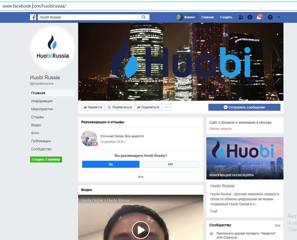 На странице Фейсбука можно увидеть целый один положительный отзыв от какого-то пользователя. На аватарке - бизнесмен в костюме, а его комментарий гласит: Отличная биржа, все нравится. Более, чем понятно, что данный отзыв написан кем-то из сотрудников Хуоби. Могли бы написать и побольше...