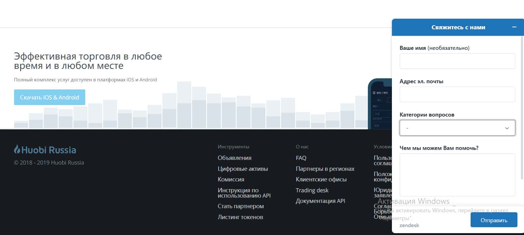 Компания Хуоби заявляет о том, что располагает отличной русскоязычной технической поддержкой. Однако, живого чата с техподдержкой нет, имеется только форма обратной связи, заполнив которую, клиент может задать вопрос. Неизвестно, сколько придется ждать ответ на него.