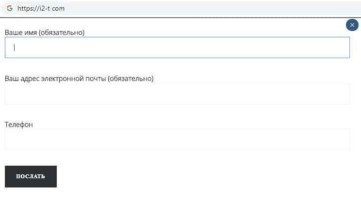 Мошенники И2-Т предлагают пользователям заполнить бланк обратной связи, где просят указать свое имя, адрес электронной почты и номер контактного телефона.