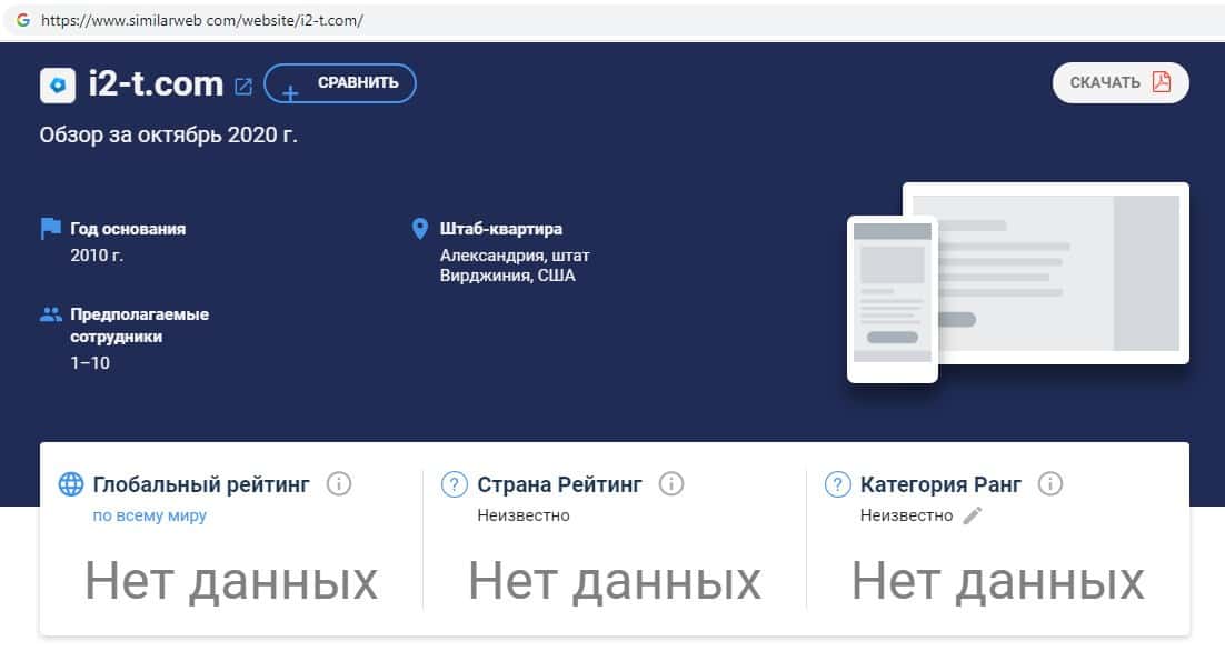 При проверке источников бренда по странам скам-компании И2-Т на сайте similarweb com, информация отсутствует, что является признаком фейкового лохотрона.