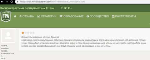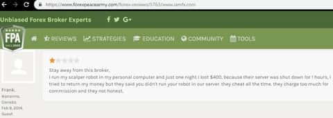 Кухня Иам ФХ предлагала торгового робота, который занимался скальпингом и должен был приносить не малые деньги в месяц. Человек повелся на эти убеждения и вложил 400 долларов. Включив автоматическую торговлю он пошел спать. На утро робот выбил ошибку по поводу нерабочих серверов, а денег на счету не было, так как он слил все под ноль. И при этом аферисты не берут на себя вины за содеянное и списывают все на форс-мажорные обстоятельства.