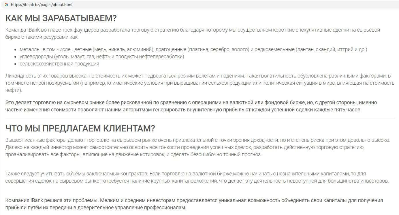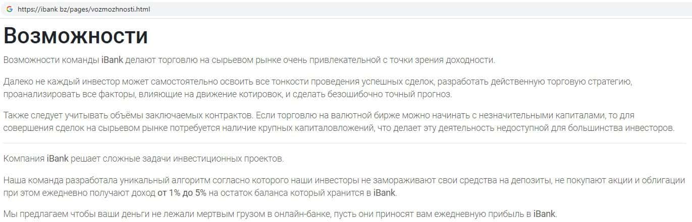 Аферисты IBank Bz предлагают инвестировать свои денежные средства в якобы прибыльное дело, рассказывая сказки о доходности.