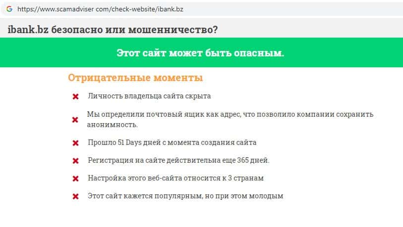 Проверка IBank Bz на сайте скамадвайсер ком показала, что данный сайт может быть опасным для использования, а также выявлено множество отрицательных моментов в работе сервера.