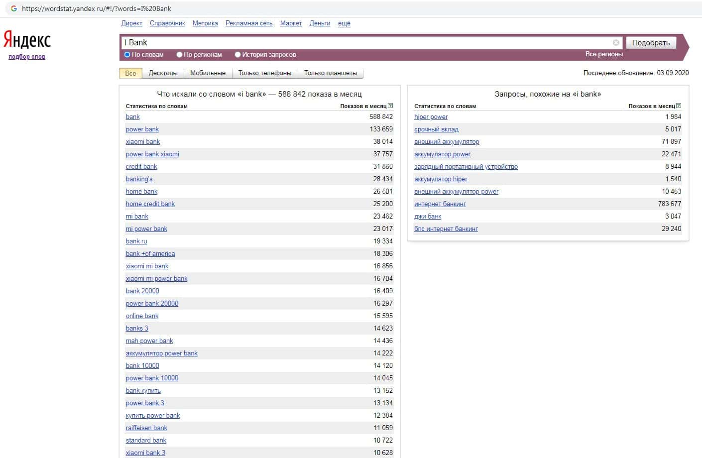 Бренд англоязычного названия компании с пробелом "I Bank" на Яндекс Вордстарт имеет достаточно высокий показатель пользовательских запросов, вероятно из-за схожести названия.