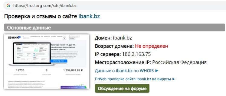 Проверка интернет-сервиса аферистов ИБанк на trustorg com показала, что определить возраст домена данного инвест-лохотрона невозможно.