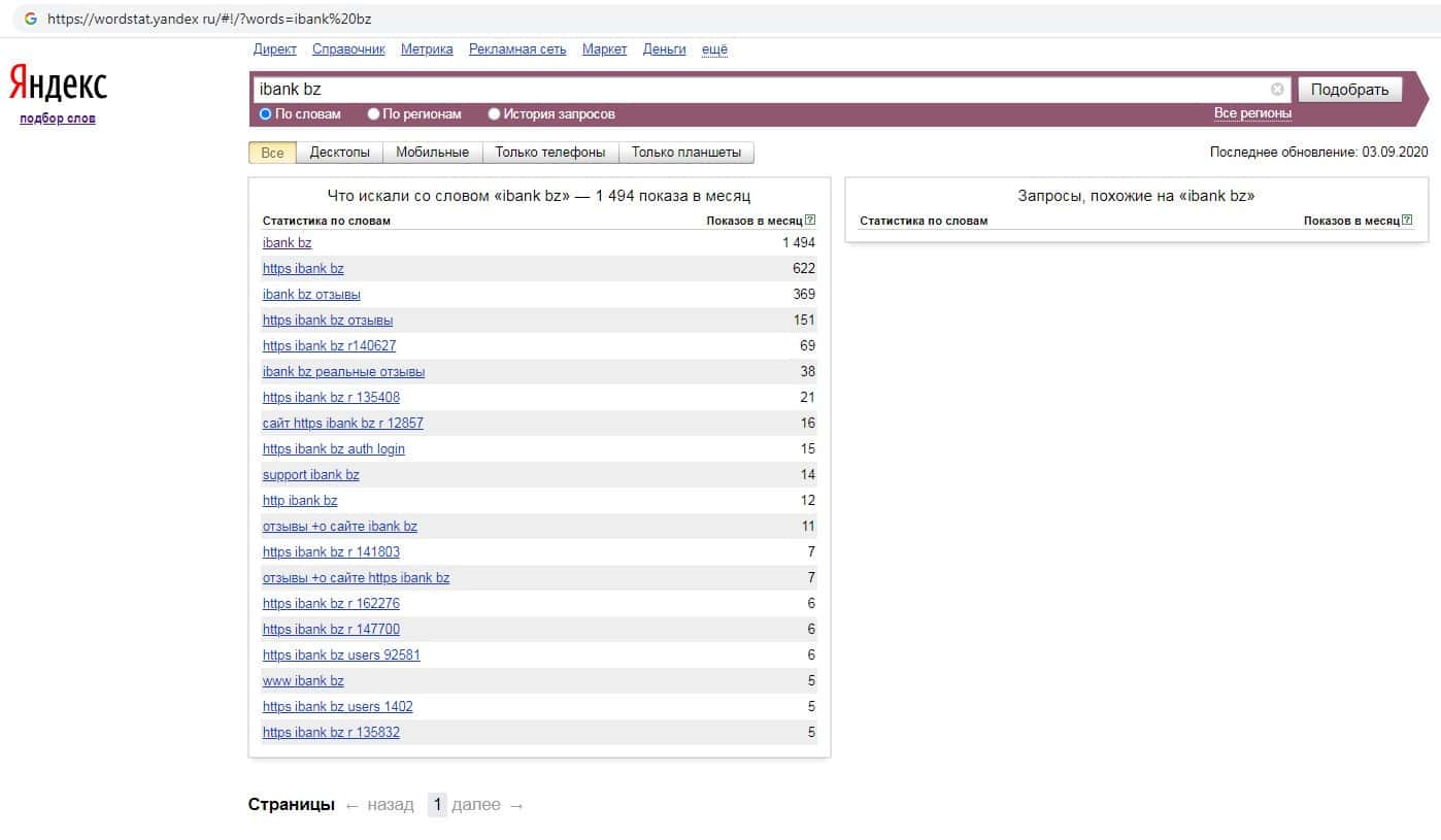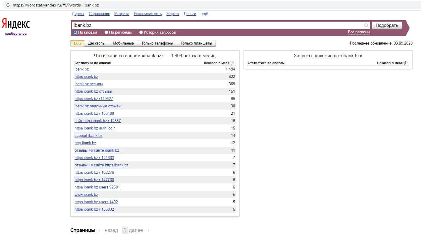 По запросам по бренду названия домена без точки "ibank bz" на Вордстарт Яндекс Ру показатель тот же, а именно 1 494 показа за месяц.