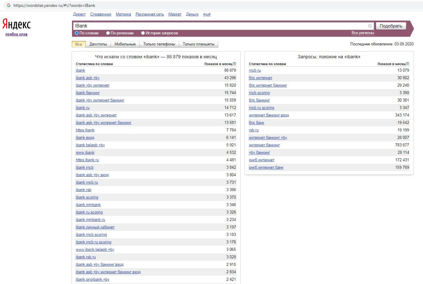 Количество запросов по бренду названия компании на английском языке без пробела "IBank" на wordstat yandex ru составило 88 879 показов за месяц.
