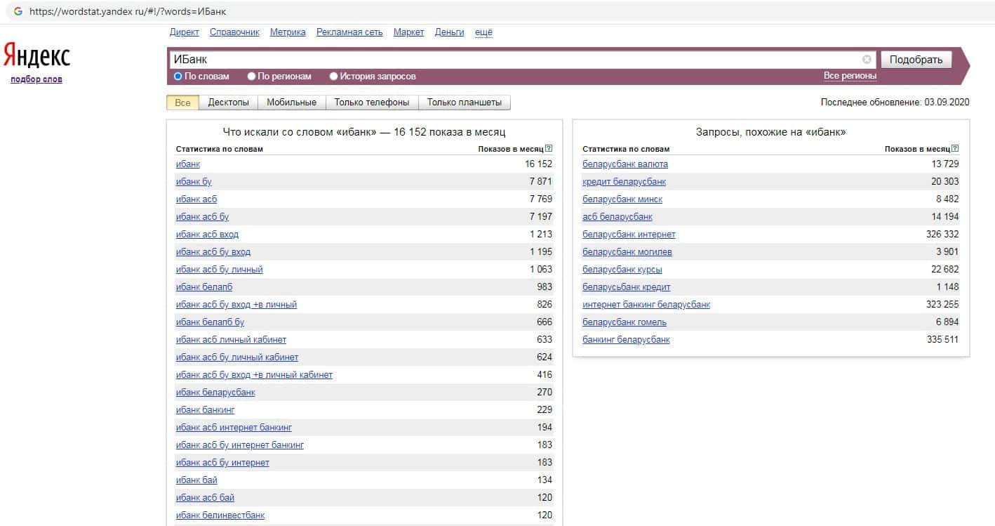 Количество брендовых запросов названия компании на русском языке без пробела "ИБанк" в поисковике Яндекс составляет 16 152 запроса за месяц.