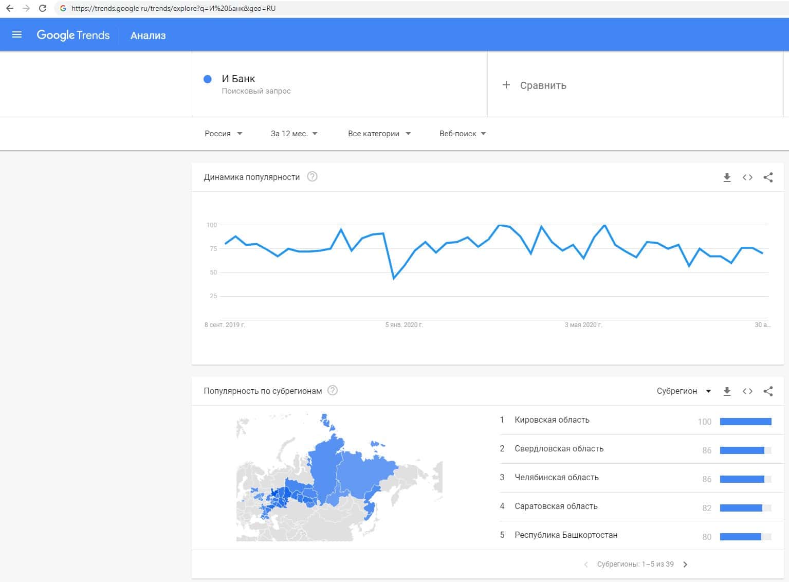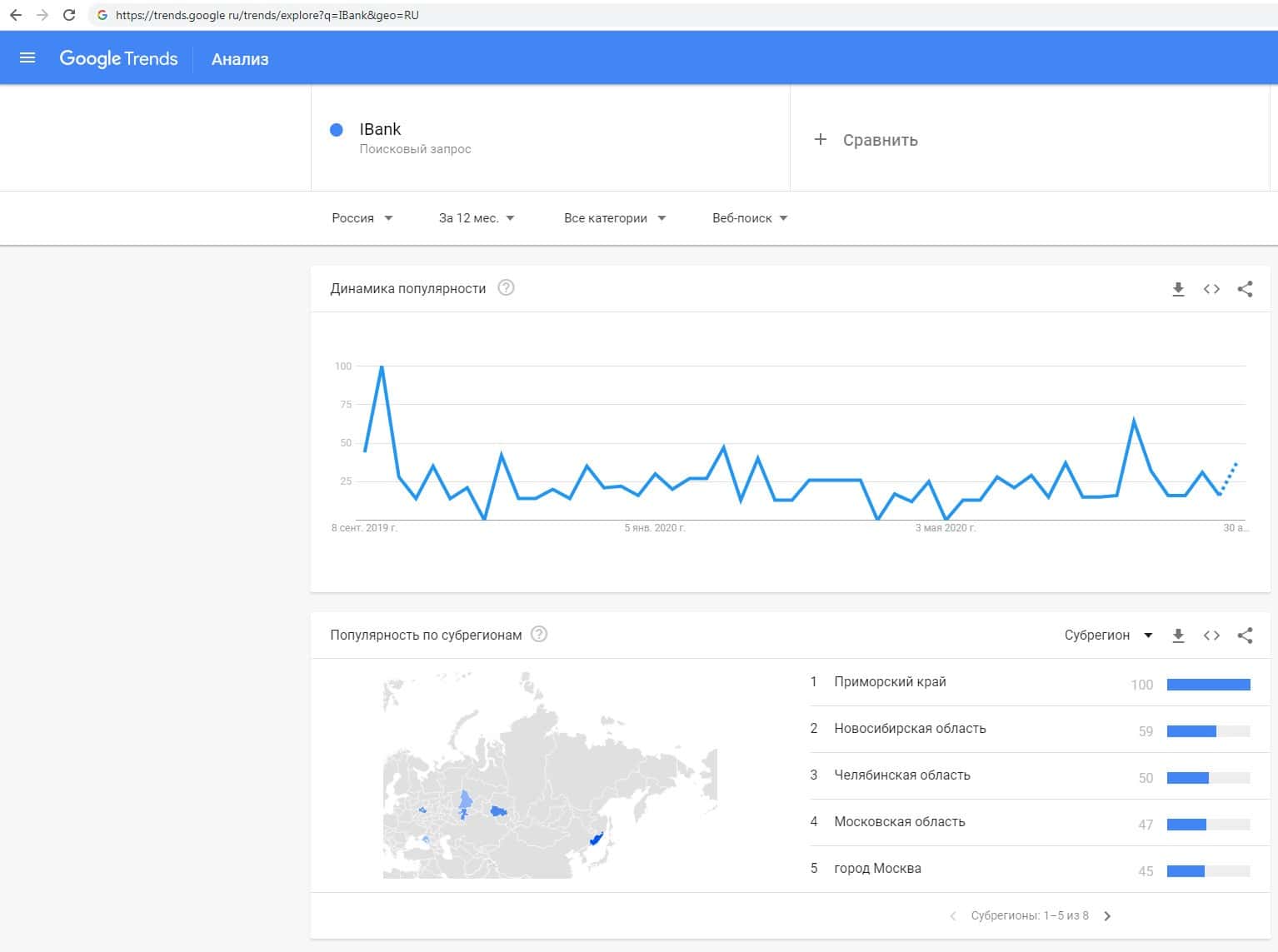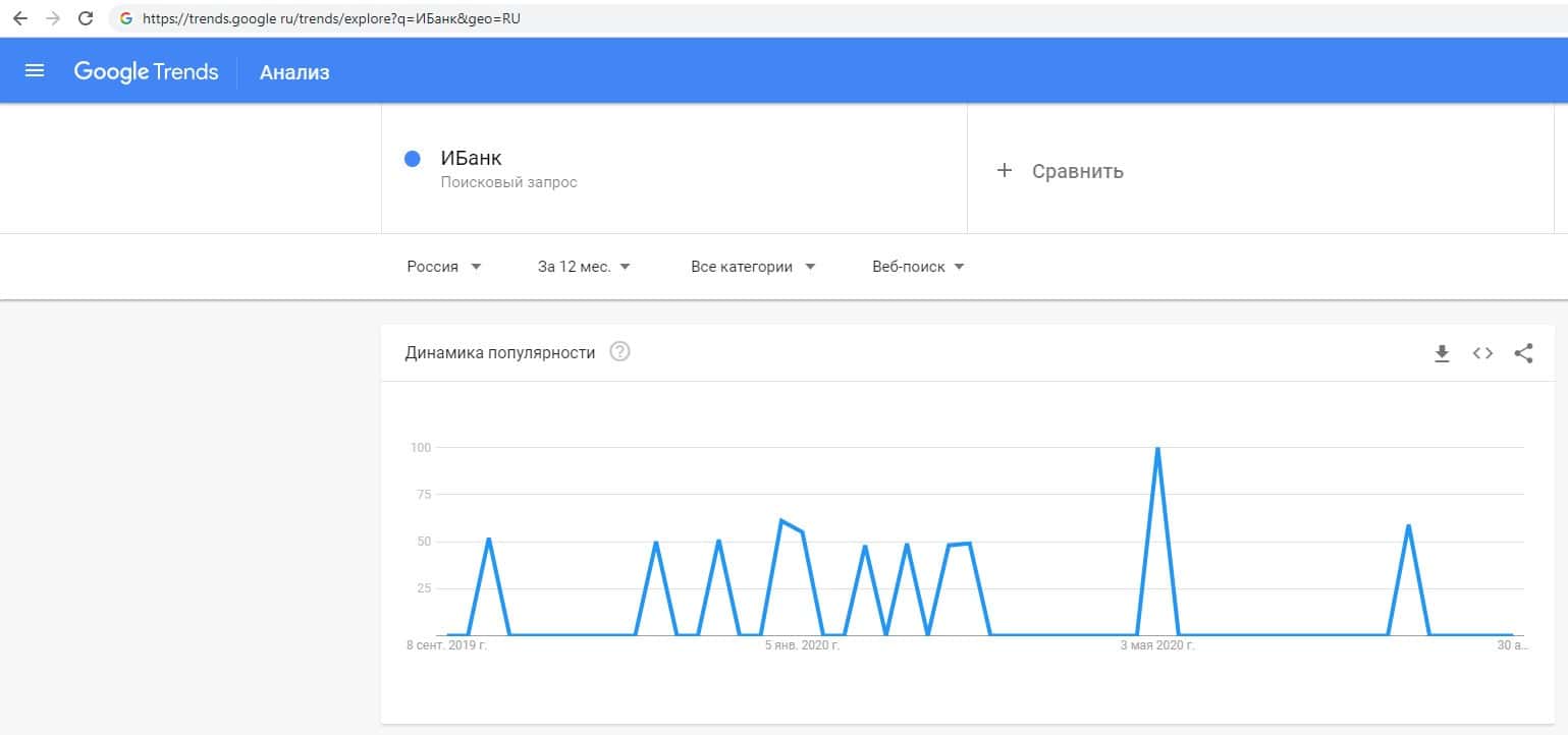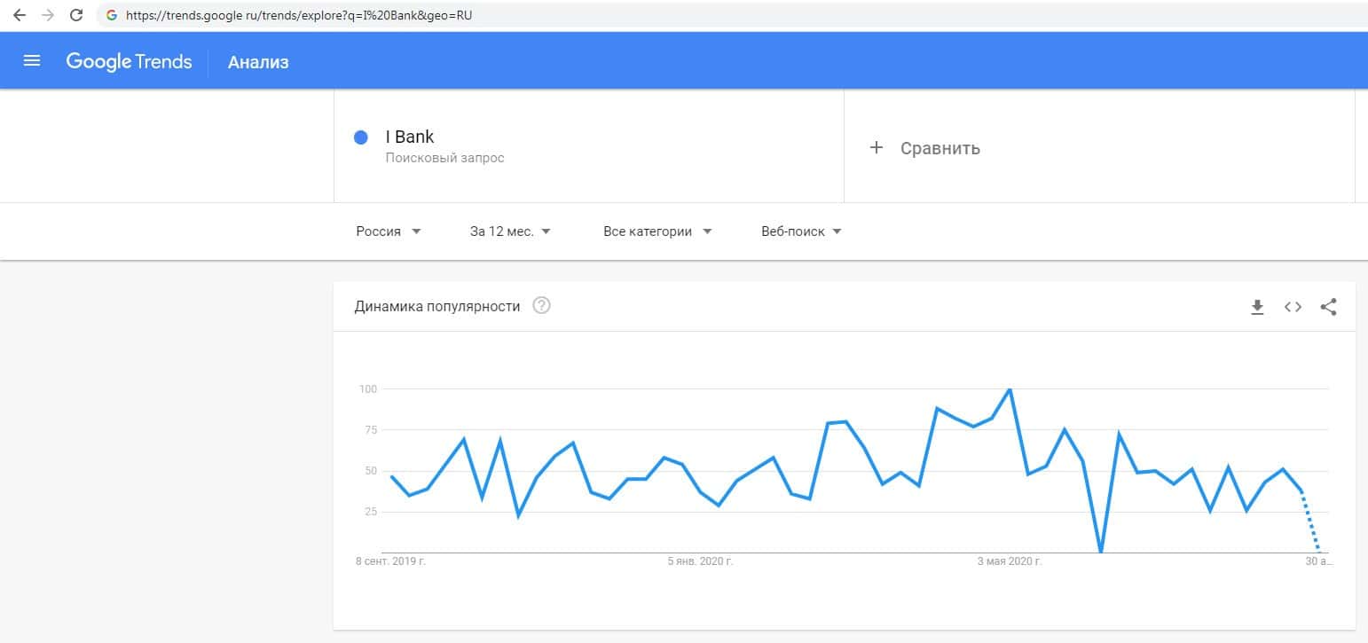 По запросам по бренду названия компании на английском языке с пробелом "I Bank" на trends google ru есть информация о динамике популярности.