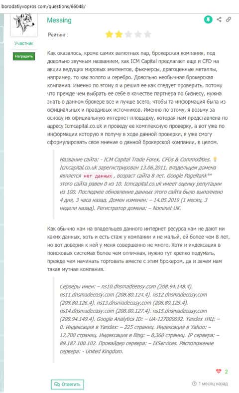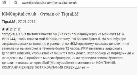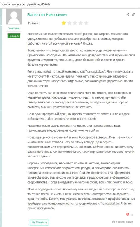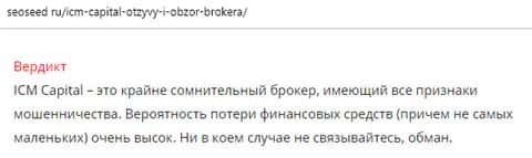 Человек очень осторожно высказал свое мнение, так как на тот момент у него было недостаточно информации касательно деятельности лохотрона ICM Capital. По мнению автора отзыва данная организация не честна на руку, так как в интернете не мало отзыв от реальных людей, которые уже стали жертвой мошенников.