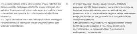 В политике конфиденциальности, которую предлагает контора ICM Capital, также есть определенная опасность. Жулики скрыли, в одном из своих пунктов, угрозу для безопасности личных данных клиента. Суть состоит в том, что шарлатаны ИСМ Капитал не несет ответственность за те ссылки, которые размещаются у них на ресурсе.