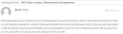 Поводом для написания данного информационного материала стала жалоба от одного из пострадавших клиентов forex-лохотрона IDB Trades, которому отказали в выводе депо. Также человек пишет о том, что ему умышленно сливали деньги со счете в процессе трейдинга в сей кухне Форекс. И здесь неважен размер суммы. Сам факт противоправных действий ИДБ Трейдс был установлен и этого хватает, дабы причислить этот ДЦ к числу мошеннических форекс-брокеров.