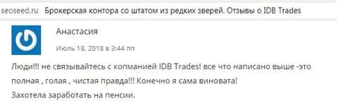 Сайт seoseed ru, на который мы уже ссылались ранее, делает обзоры на качественные и не очень способы заработка в Сети. Как можно понять, контора ИДБ Трейдс относится ко второму типу, который не поможет вам заработать, но заставит понести большие потери, как материальные, так и моральные.