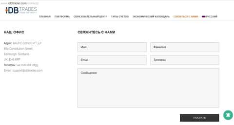 Контакты, указанные на сайте о местоположении компании – липа. Что же по поводу "свяжитесь с нами", то можете попробовать, но у вас, как и у десятков других обманутых клиентов, достучаться до мошенников ИДБ Трейдс не получится.