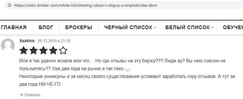 Мошенники IDCM очень хорошо заметают за собой следы. Они стараются чистить негативные отзывы, а вместо них пишут положительные, призывающие людей к торговле. Это всё объясняет то, что за столько времени существования компании о ней так мало отзывов, хотя за такое время обычно набирается очень большое количество отзывов.