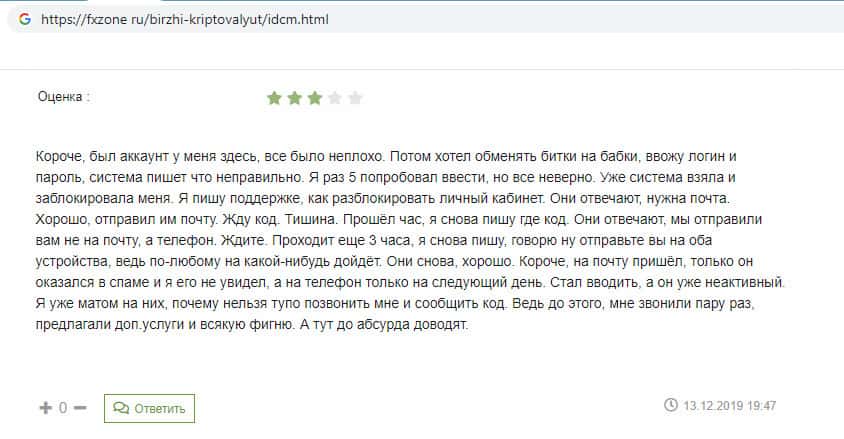 Данный клиент мошенников IDCM рассказывает о своём печальном опыте сотрудничества с аферистами. Он рассказывает как как хотел обменять битки на деньги, то его аккаунт сразу заблокировали и потом просто игнорировали его сообщения и звонки, компания не отвечала и тянула время что бы не возвращать пользователю его аккаунт.