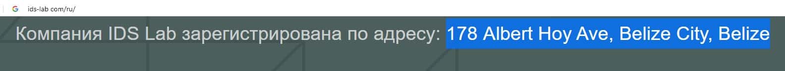 Местом регистрации скам-брокера IDS Lab является оффшорное государство Белиз, где зарегистрировано огромное количество аналогичных онлайн-лохотронов.