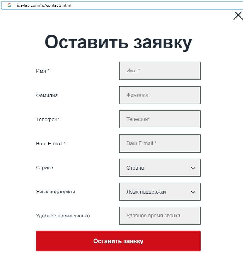 Шулера ИДС Лаб предлагают пользователям заполнить бланк обратной связи, где просят указать свое имя, фамилию, адрес электронной почты и номер контактного телефона.