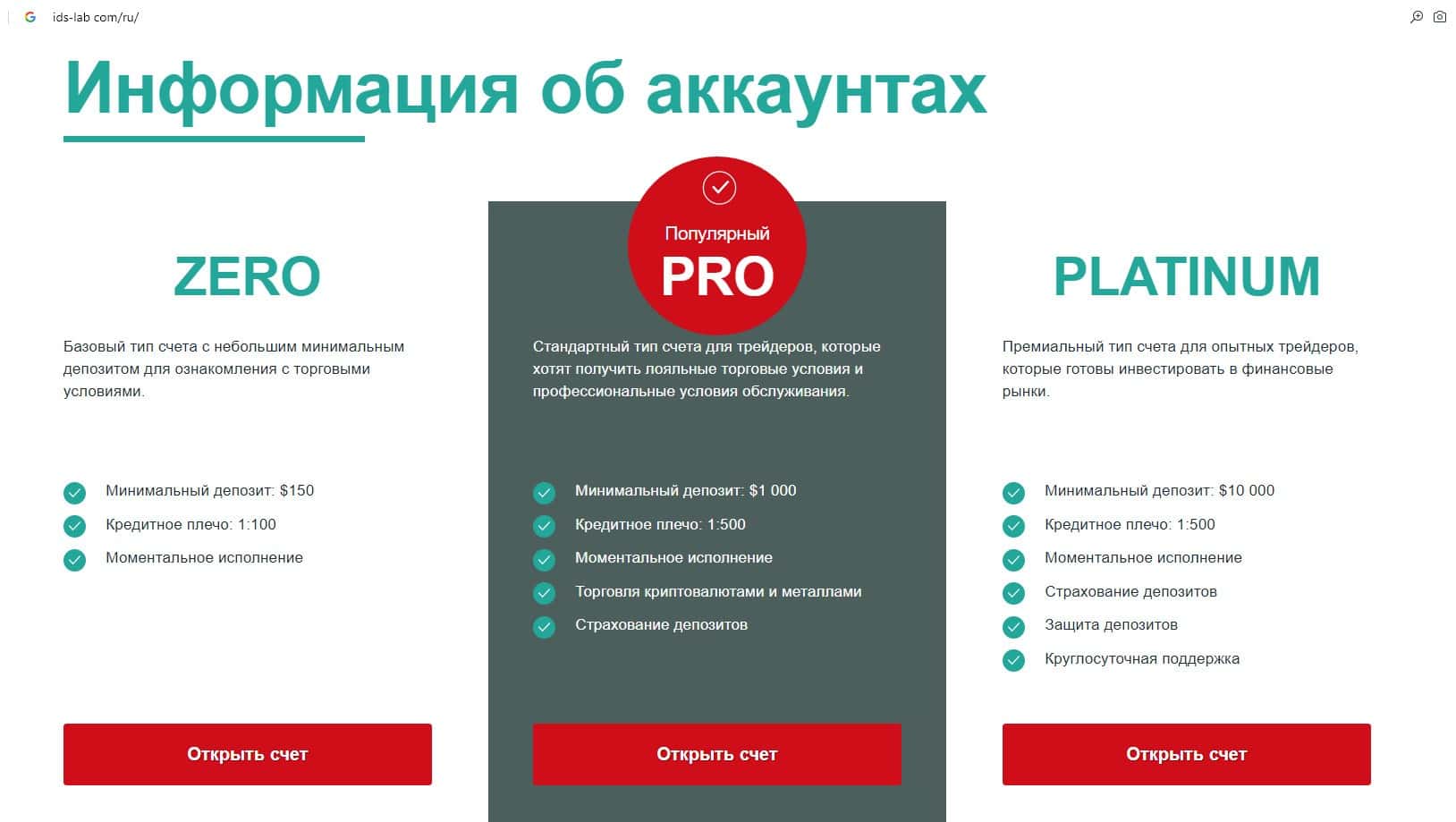 Жулики IDS Lab предлагают клиентам на выбор 3 типа торгового счета: Zero, Pro, а также Platinum. Реальный форекс стартует в основном с суммы в 100000 долларов.